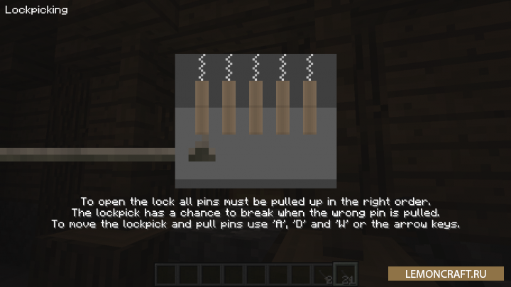 Данный мод введет в игру замки трех уровней, которые вы можете применить к сундукам и дверям. Помимо этого появится система взламывания замков про помощи отмычек.